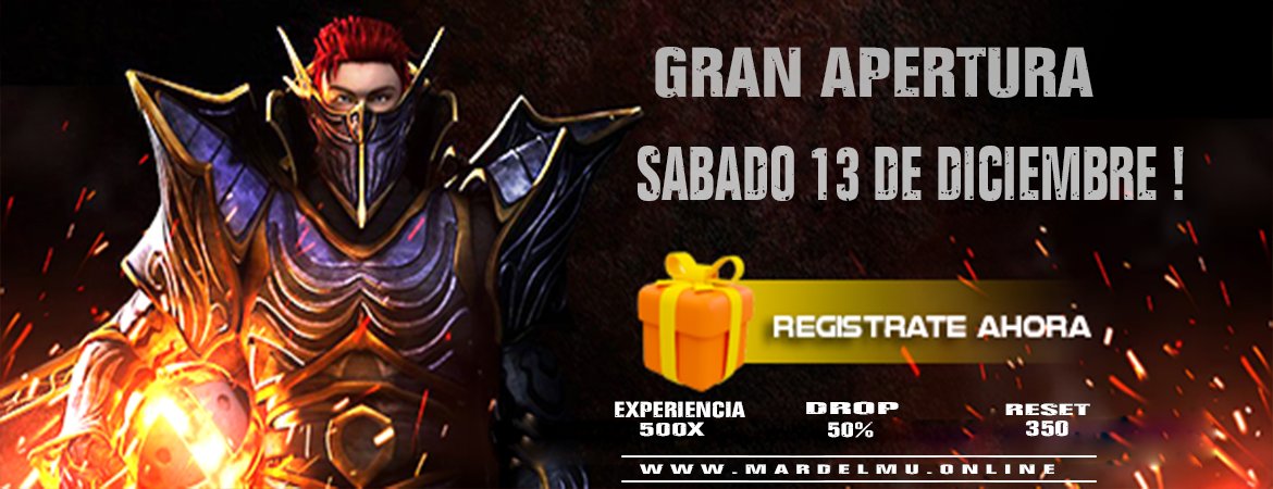 Bienvenido a MarDelMU! / Servidor privado de Mu Online v0.97x / / soporte: [email protected]| Exp 500x | Drop 50% | Reset 350 / Publicado por ADMIN.